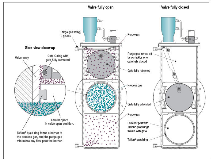 兩個(gè)分開的支架可以實(shí)現(xiàn)100%電導(dǎo)(全開)或者0%電導(dǎo)(全關(guān)). 在打開的位置,一個(gè)流孔從流動(dòng)路程和所有內(nèi)部部件是隔離開的。這個(gè)孔口提供了一個(gè)通過發(fā)力的清潔的連續(xù)的流動(dòng)路程并且減少了和任何一個(gè)閥體裝置的工業(yè)廢氣接觸. 關(guān)閉位置使用一個(gè)傳統(tǒng)的密封膠圈以產(chǎn)生1x10E-9Torr的真空密封. 線性驅(qū)動(dòng)允許使用焊接波紋管來密封驅(qū)動(dòng)器并且減少旋轉(zhuǎn)密封圈的必要性。獨(dú)特的氣缸設(shè)計(jì)使沖擊和振動(dòng)減少到最小. 此設(shè)計(jì)非常有益于半導(dǎo)體制造和其他敏感加工工業(yè)要求操作時(shí)相對(duì)自由振動(dòng)的.